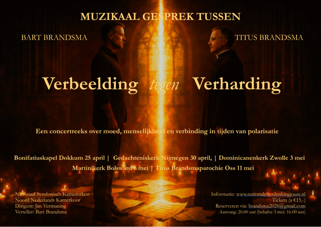 In april en mei 2026 gaat de landelijke concertreeks Muzikaal Gesprek tussen Bart en Titus Brandsma van start. In deze bijzondere serie komen muziek, filosofie en maatschappelijke reflectie samen in een indringende dialoog over polarisatie, morele moed en menselijke waardigheid. Filosoof en polarisatie-expert Bart Brandsma gaat – in woord en gedachte – in gesprek met Titus Brandsma (1881–1942), priester, denker en martelaar, wiens leven en gedachtegoed niets aan actualiteit hebben ingeboet.